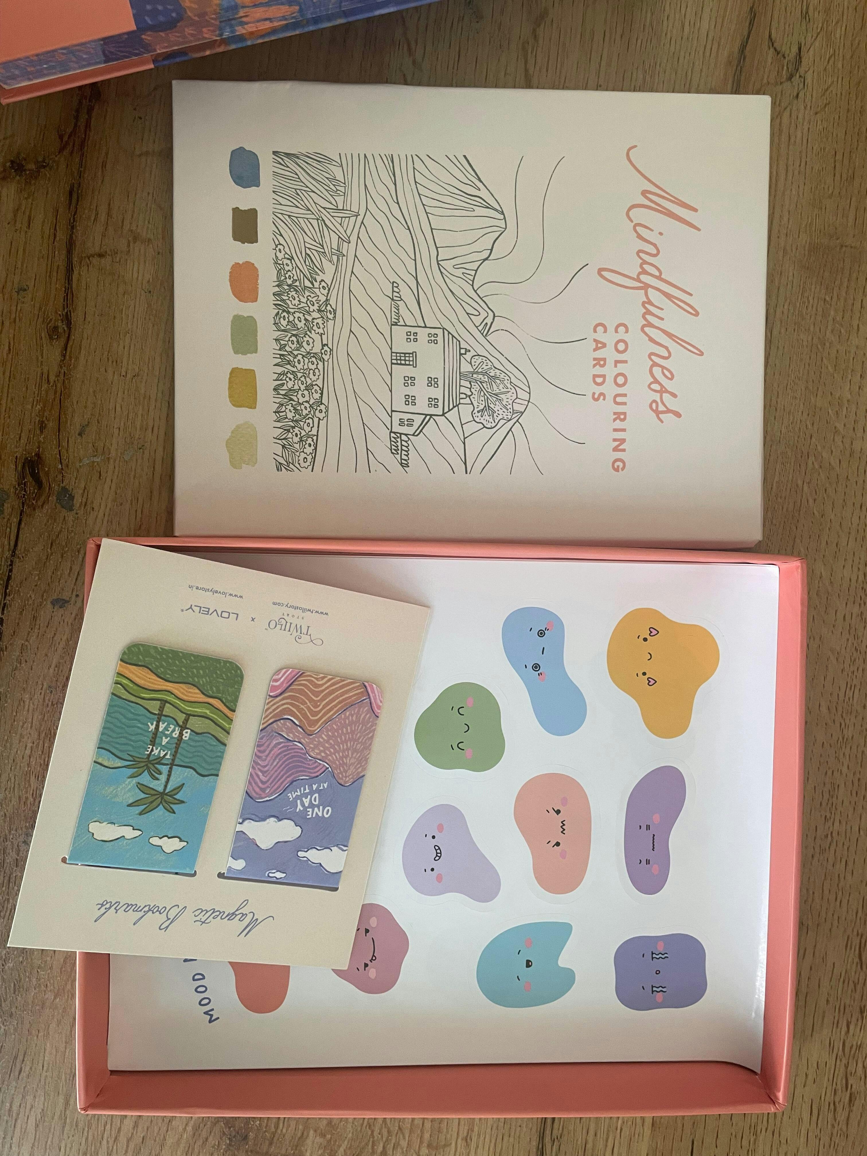 IN LOVE WITH IT. those cute stickers. the bookmarks. quality of the journal. my name on it. wow. but i didn’t receive my brush with the coloring cards.